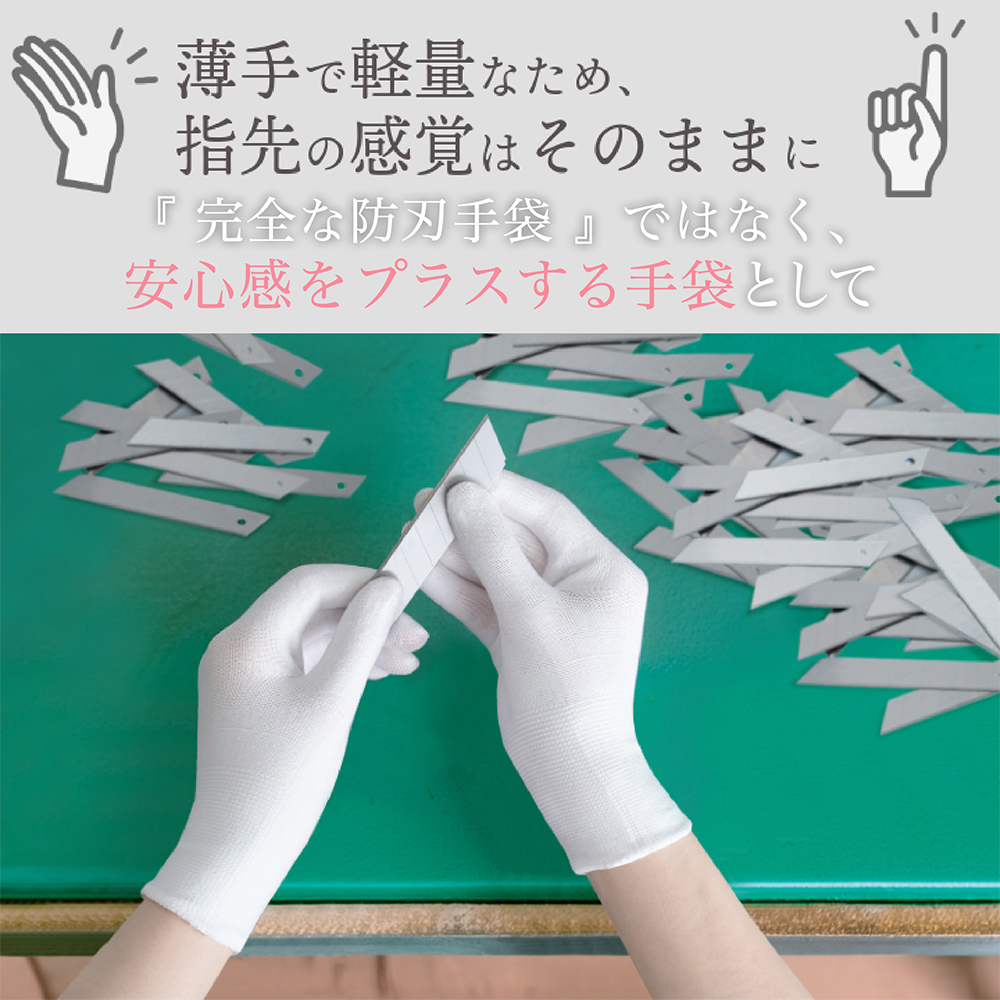 完全な防刃手袋としてではなく、作業をする際にうっかり手を切ってしまうなどの軽い怪我を防ぐ“ 安心感をプラスする手袋 ”としてお使いください。