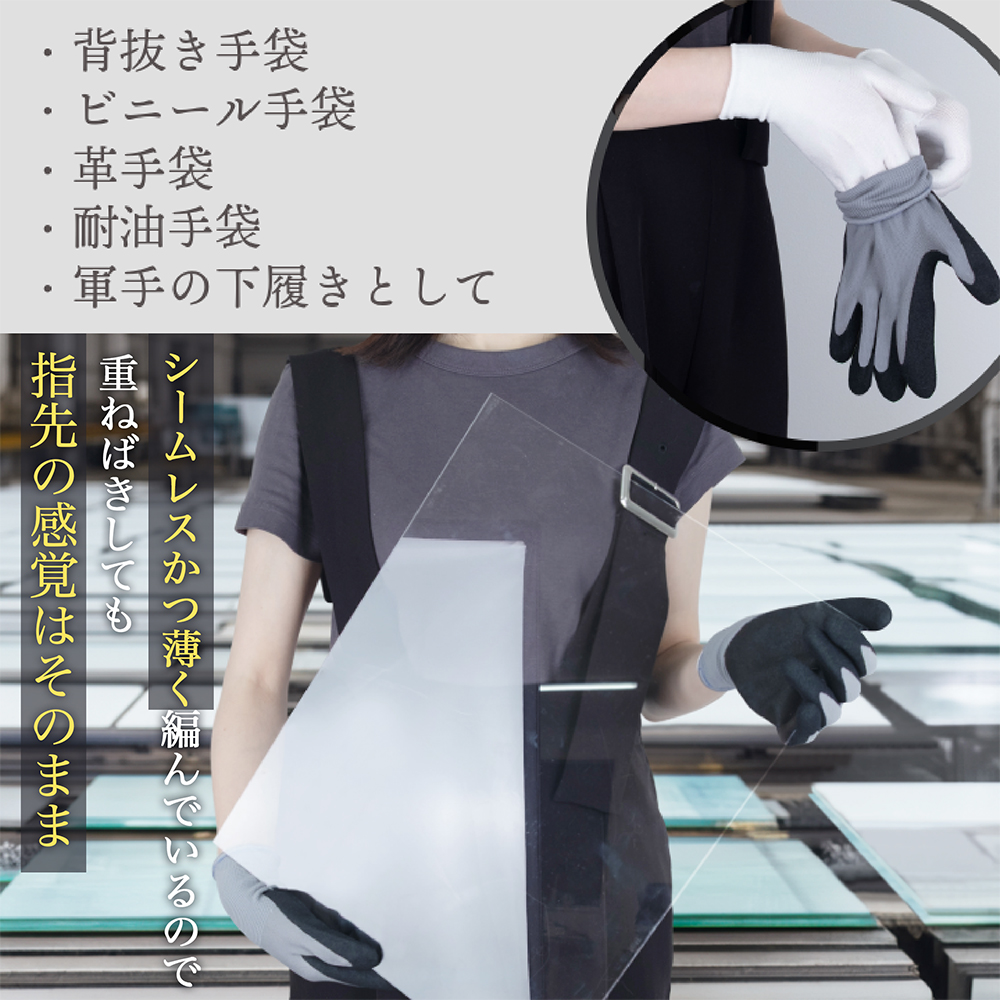 例 ガラスなどの繊細で怪我しやすい素材をあつかう現場の背抜き手袋の下履きとして