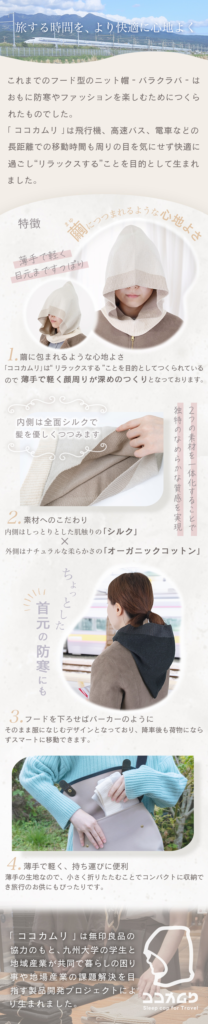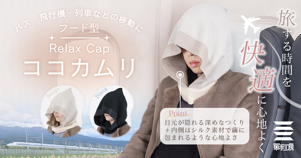 | 用途 | 飛行機、新幹線、高速バス、電車などの移動中にまわりの目を気にせず快適に過ごすためのフード型リラックスキャップです。ちょっとした防寒にも使えます。 |