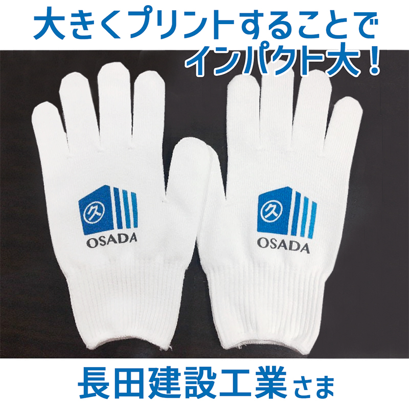 長田建設工業さまより会社のロゴをプリントしたオリジナル軍手のご注文いただきました! 使用した手袋の種類は【 13G綿のびのび手袋 晒 ホワイトスベリ止付 】です。