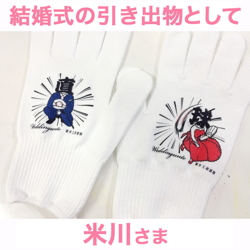 米川さまより結婚式の披露宴にて軍手を『ウェディン軍手』としてゲストの方々にプレゼントしたいとのことでご注文いただきました! 使用した手袋の種類は【 13G綿のびのび手袋 晒 】です。