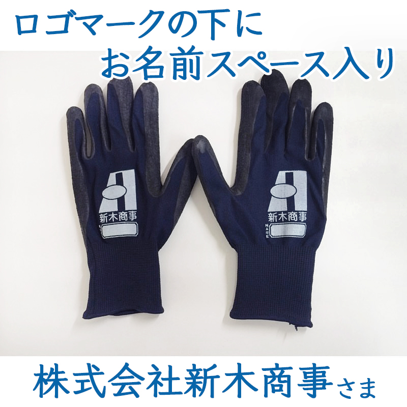 新木商事さまより、「背抜き手袋」に「ラバープリント」でのご注文いただきました! 今回のデザインは会社ロゴマークの下にそれぞれ使用する人の「名前記入スペース」が欲しいとのことでしたので、そちらも加えております。 使用した手袋の種類は【 ゴム背抜き手袋 】です。