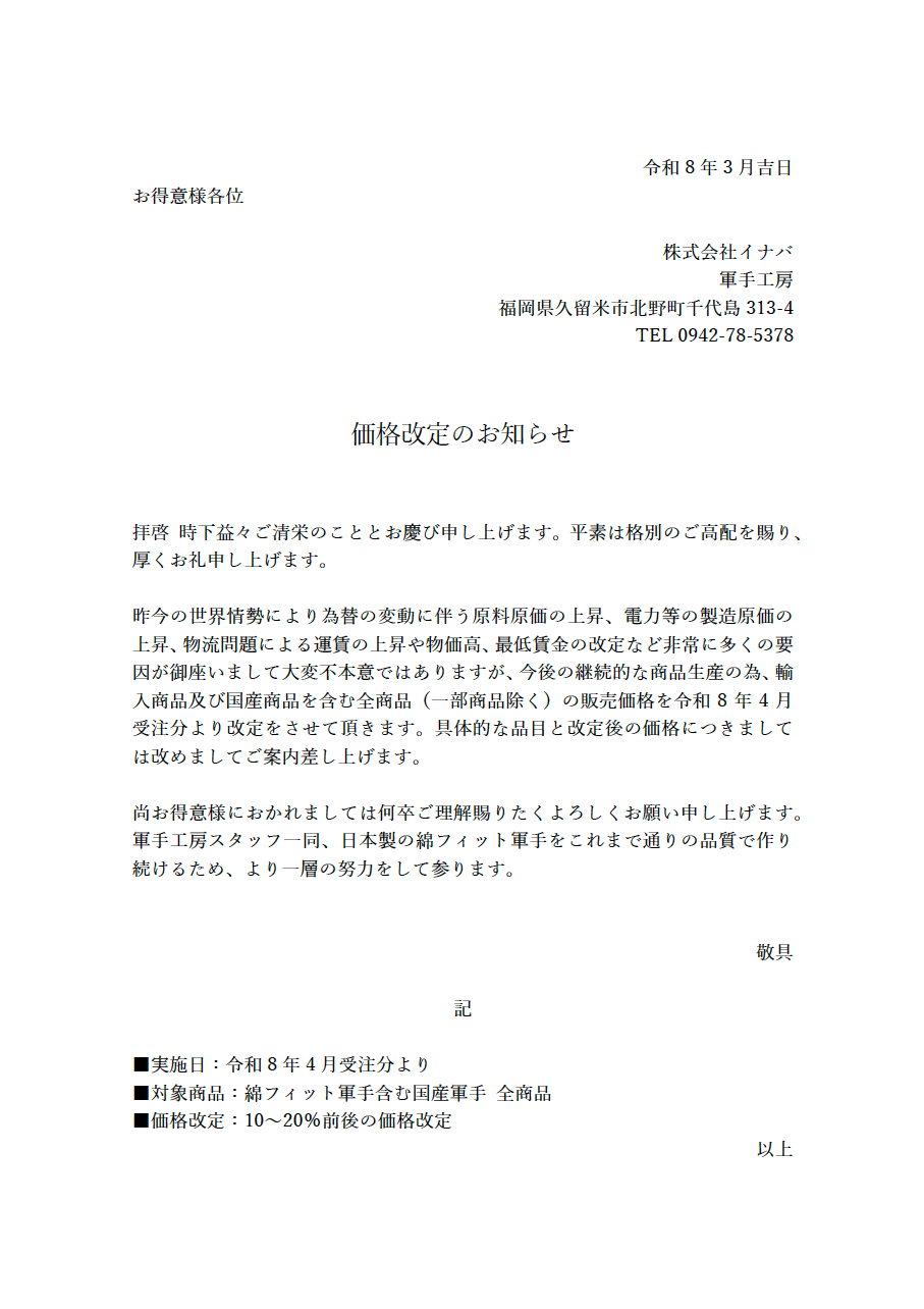 軍手価格の価格改定につきまして【令和8年4月分より】