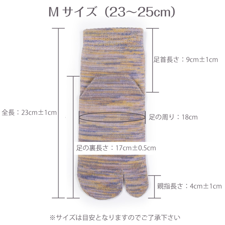 | サイズ | Mサイズ(23〜25cm) 全長:約23cm 足裏長さ:約17cm 足の周り:約18cm 足首長さ:約9cm 親指長さ:約4cm Lサイズ(25〜27cm) 全長:約28cm 足裏長さ:約20cm 足の周り:約18cm 足首長さ:約11cm 親指長さ:約4cm |
