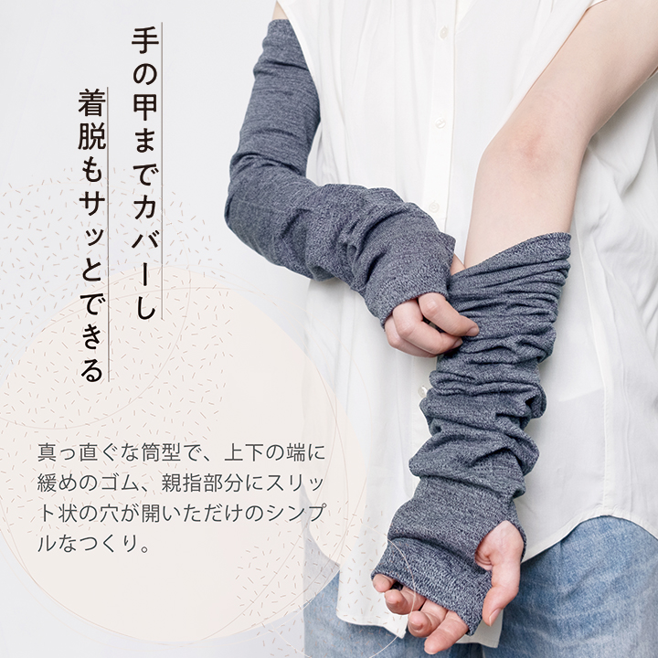 まっすぐな筒型で、上下の端に緩めのゴム、親指部分にスリット状の穴が開いたシンプルな形状です。締め付けないゆったりしたつくりなので、サッと着脱できます。